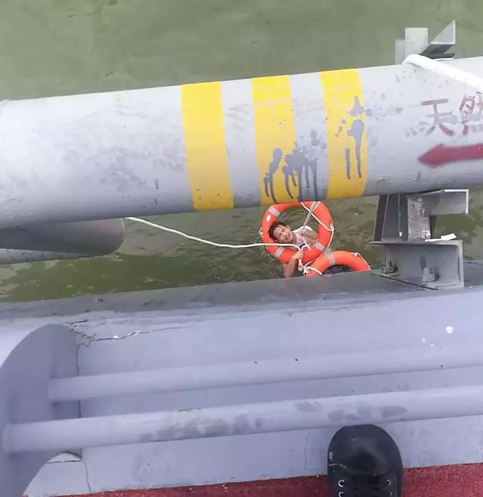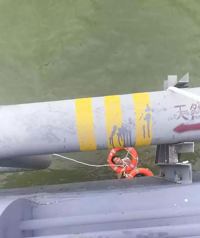 不到一分鐘時間,兩位隊員已趕到現(xiàn)場,此時該游客已跳進(jìn)海里,并抱著橋墩,橋上還遺留著一個不滿兩歲的幼兒。“不要放棄求生,抱緊橋墩,救援馬上