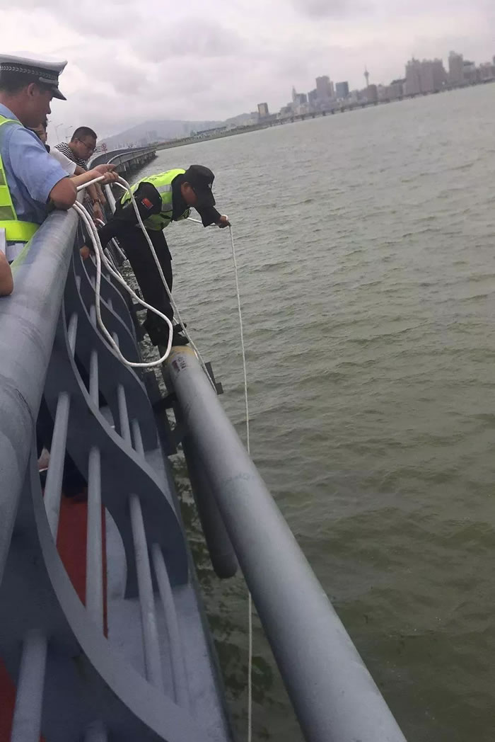 那是一個平凡的周日,保安員楊立、呂法文像往常一樣在港珠澳大橋花都公路口岸橋頭崗執(zhí)勤。16時,值班室接到游客報警,稱施工便橋上有人輕生,楊力和呂法文立刻趕往現(xiàn)場并同時向上級負(fù)責(zé)人報告,上級指示,“在保證自身安全下第一時全力救人!”